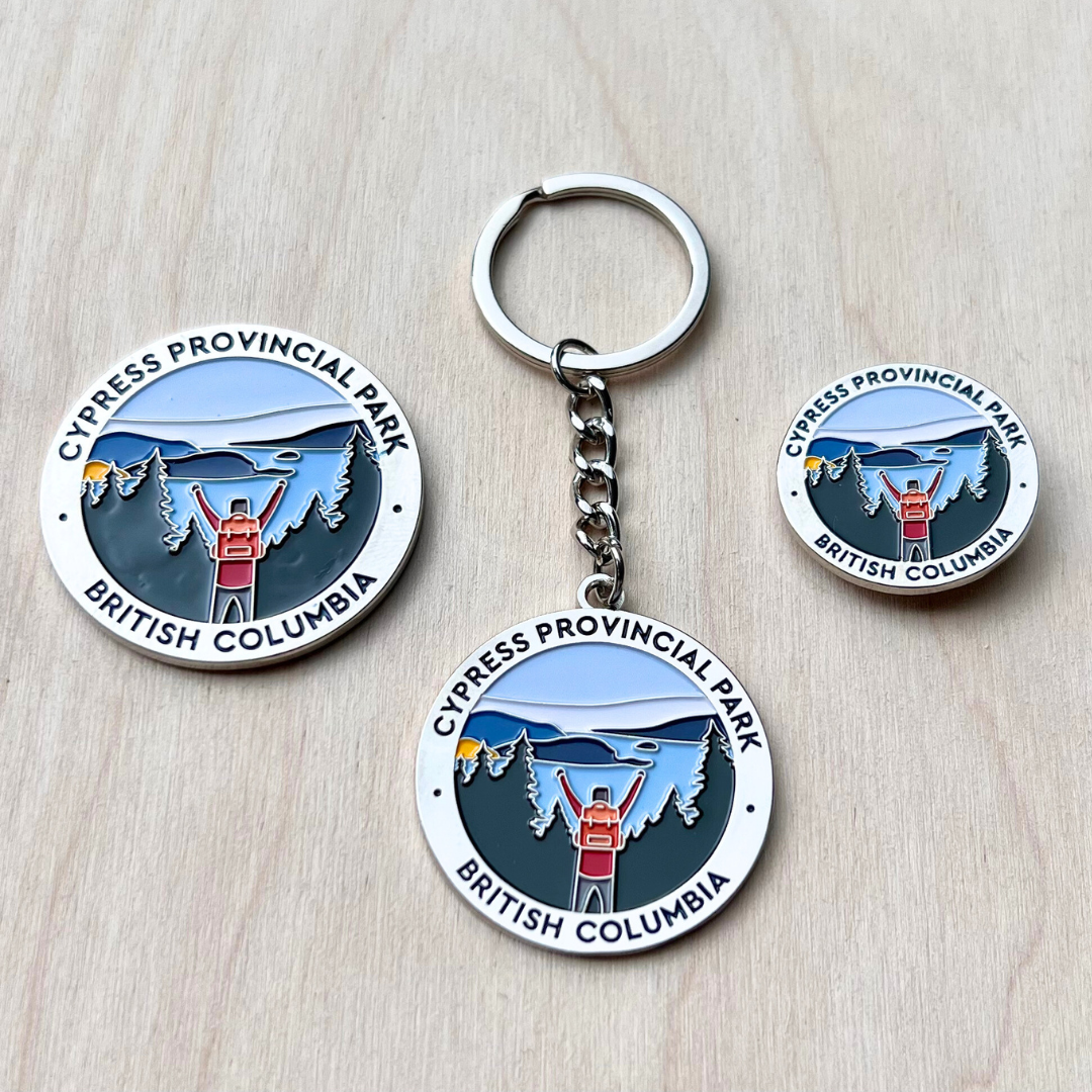 Crafted with polished silver and vibrant soft enamel colours depicting the stunning views of Cypress Provincial Park