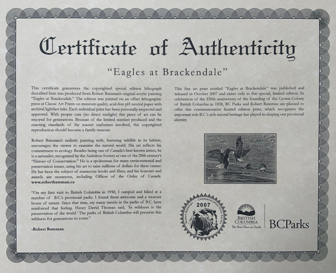 A limited edition reproduction of renowned BC artist and naturalist, Robert Bateman's original acrylic painting, Eagles at Brackendale, this beautiful piece is part of a set of 4 stunning prints featuring wildlife in four BC parks and protected areas: