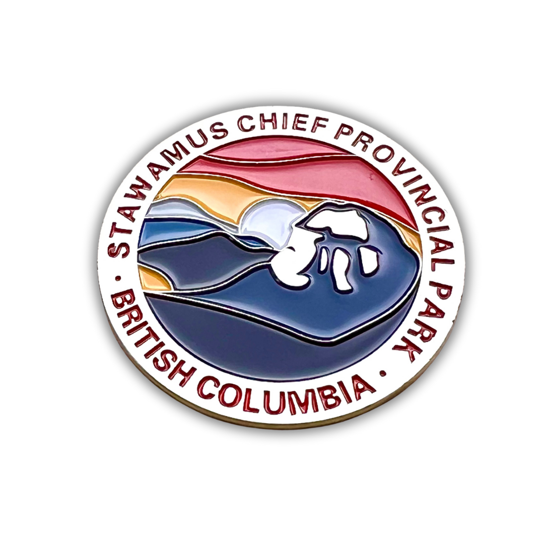 Polished silver finish adorned with vibrant soft enamel colours depicting the iconic Stawamus Chief